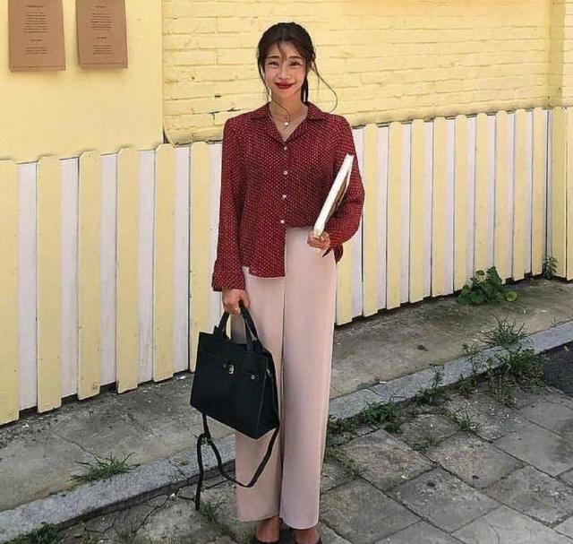 ​美女所穿的這件紅色波點襯衣是一種非常熱情的色調,而且這樣的衣服讓整個人看起來會更加開心。在下身她穿的這件休閑褲子,走起路來不會感覺到累,而且這種皮粉色會有一種小女人的風采,整件衣服上身顏色重,下身顏色輕。是一種很自然的穿搭樣式。