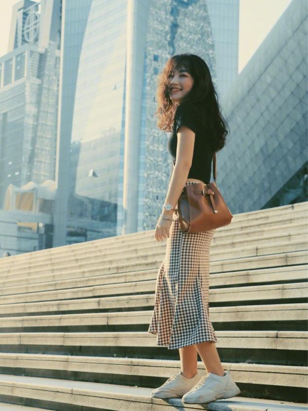 ​此時美女所穿的這身衣服是一款非常經典而且大氣的設計樣式,她在上身穿着一件黑色的短款背心,這樣的背心即使在夏天的季節里穿也是很可以的。這種簡單的造型,非常的百搭,此時她在下身穿着一件包臀格子裙。裙子的上半部分為包臀設計樣式,而下半部分採用了比較寬鬆的樣式,既有一種性感的取向,也有一種非常甜美的性格。其實,如果在夏天的時候穿這個上衣,再下身穿一件百褶裙或者牛仔短褲都是非常漂亮的。