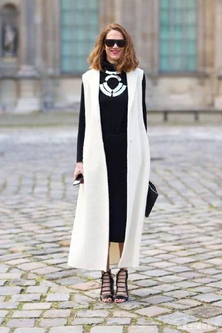 直筒連身裙屬於寬鬆版型的長裙,任何身材都可完美駕馭。黑色元素又特別顯瘦顯高,外搭長款白色馬甲,不僅時尚有范,而且氣質具佳。堆領直筒連身裙胸前的白色裝飾物又與白色長馬甲相互呼應,配露腳背黑色高跟鞋,優雅時尚。